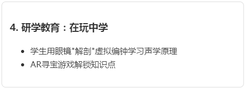 国家数字化教育政策推动;VR/AR课件成为K12标配;职业培训AR认证体系建立