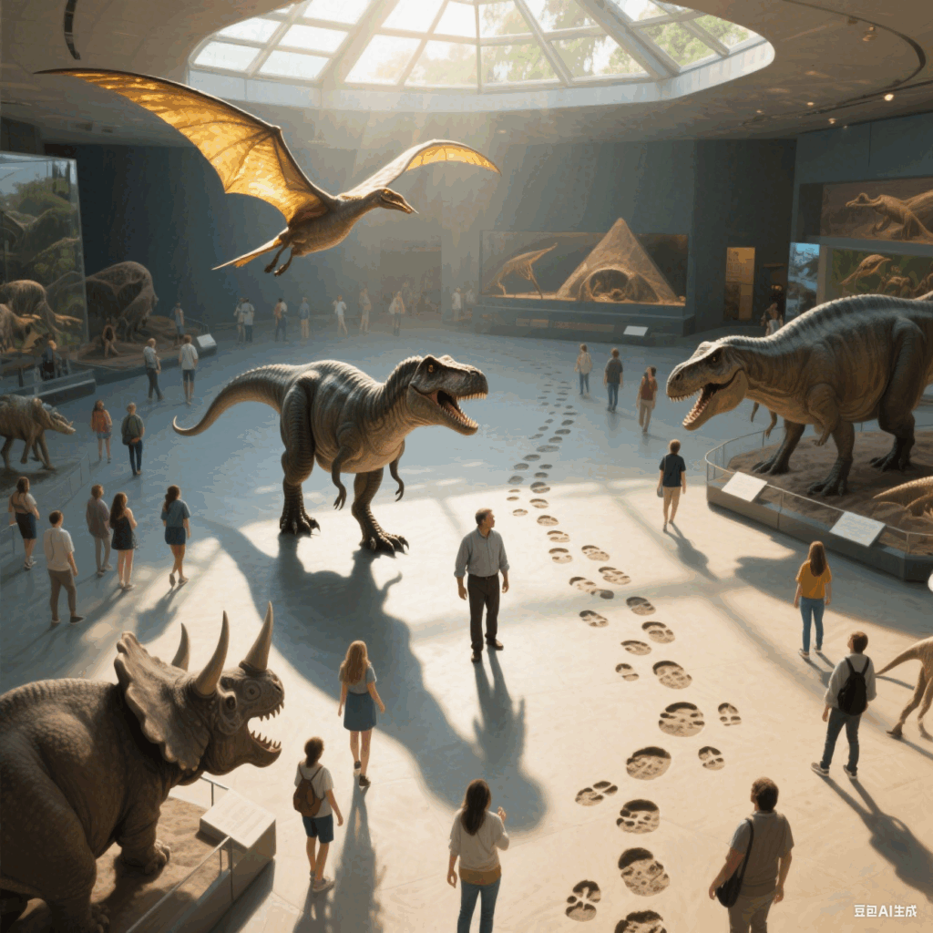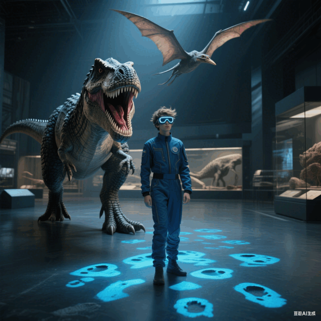 • 时空穿梭体验:在古生物展区,霸王龙正踱步而来,它的每片鳞甲都随着呼吸微微颤动,突然翼龙从头顶掠过,您能感受到它翅膀扇动的气流,地面浮现恐龙足迹光影,跟随行走可触发不同物种的捕食场景