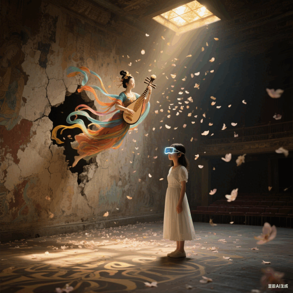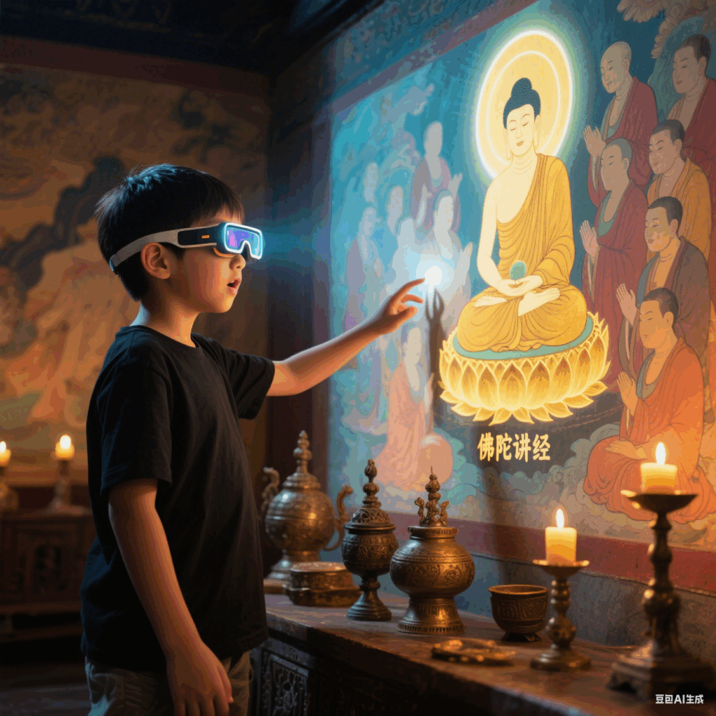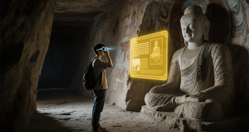 戴上AR眼镜,斑驳的石窟墙面瞬间焕发新生,褪色的壁画重现盛唐华彩,残缺的造像复原庄严法相。一场跨越时空的文化朝圣就此展开…