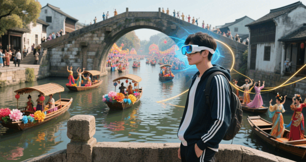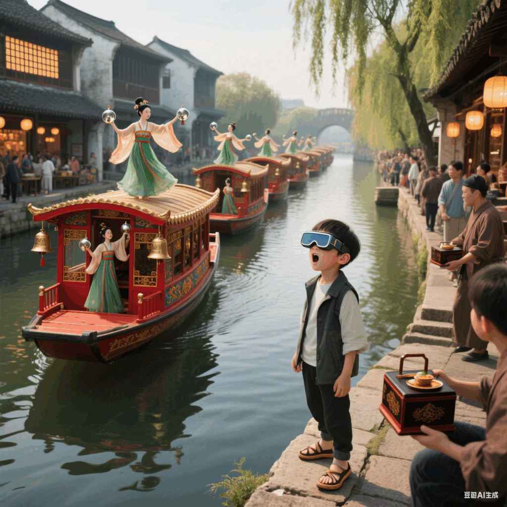 当您戴上AR眼镜,眼前的青石板路突然泛起涟漪般的光晕——时空的帷幕徐徐拉开,一场千年前的繁华盛景正在您眼前复活